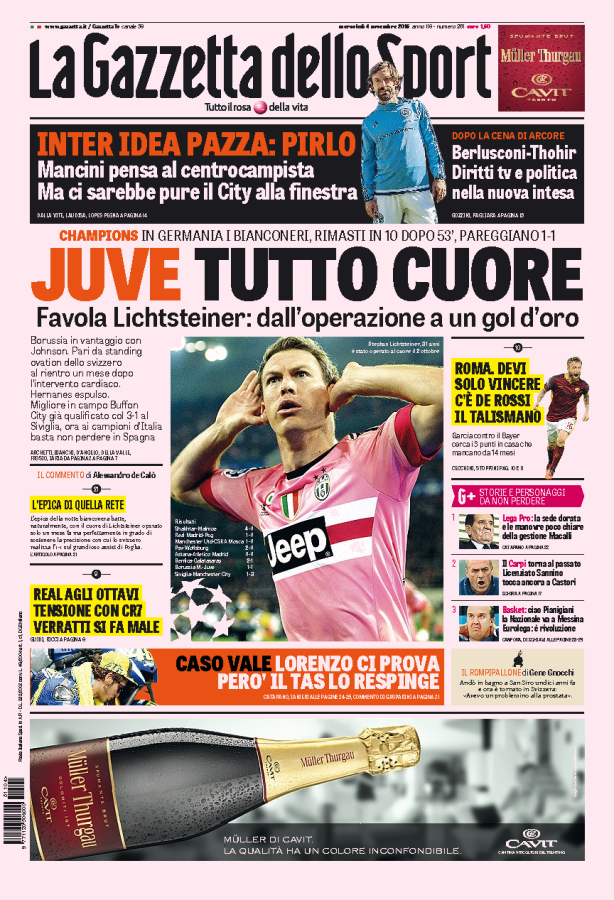 Fino a qualche tempo fa ero convinto che soltanto in Gazzetta esistesse una STI: Sezione Titoli Idioti. Col passare del tempo mi sono dovuto ricredere perché anche i quotidiani sportivi del Gruppo Amodei (Corriere dello Sport-Stadio e Tuttosport) si sono dotati di analoga struttura. O magari, chissà, hanno affidato anche questo segmento del giornale all’ennesimo service esterno. Sia come sia, c’è che oggi tutti e tre i quotidiani sportivi italiani hanno titolato stesso modo. E sarà vero che il tema del giorno è il pareggio della Juventus in Champions League ottenuto grazie a un gol di Lichtsteiner, giocatore che nelle settimane scorse è stato fermo a causa di problemi cardiaci. E però, almeno un po’ di fantasia. E invece, questa è la panoramica dei titoli di prima pagina: Gazzetta dello Sport, “Juve tutto cuore”; Corriere dello Sport-Stadio, edizione nazionale, “Cuore da Juve”; Tuttosport, “Cuore Juve”. Un’invidiabile fantasia. E non oso immaginare come i tre quotidiani sportivi titoleranno nel giorno in cui Balotelli guarirà dalla pubalgia.